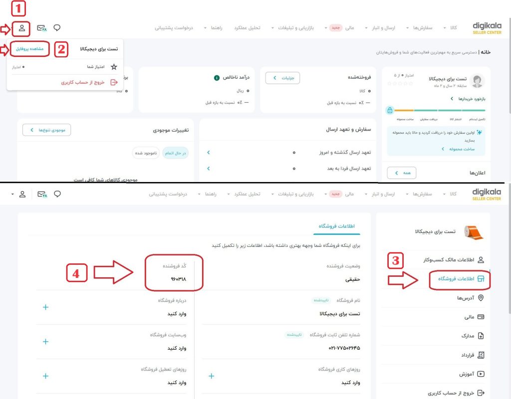 برای پیدا کردن کد فروشندگی خود و تکمیل فرم مطابق تصویر زیر در پنل روی عکس آدمک کلیک کنید سپس روی مشاهده پروفایل کلیک کنید و از منوی سمت راست اطلاعات فروشگاه را انتخاب و کد فروشندگی خود را مشاهده کنید.
